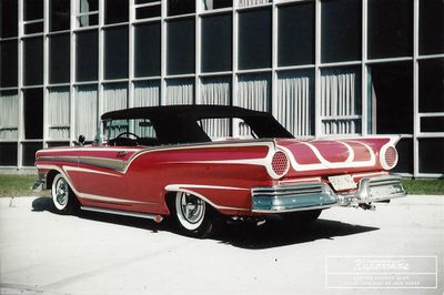 1957 Ford owned and restyled by Don Boeke of Dayton, Ohio. The Ford was Don's first custom after he was discharged from the US Navy. Modifications included a Canadian grille, custom taillights, pearl scallops, with blend, lake pipes, custom hubcaps, four-pipe exhaust headers. "All work done by myself in a one-car garage I rented up the street for $15 a month," Don told Sondre Kvipt of Kustomrama in 2019.[1] He eventually sold the Ford and bought a 1961 Corvette, that he immediately customized with paint and wheels.[2]