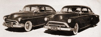 George Cerny's own personal ride for a while was this 1949 Chevrolet four-door Fleetline. George built this cars in a period of two months.[1] He replaced the two piece Chevrolet windshield with a single piece 1950 Oldsmobile unit. Chrome window molding from a 1950 Pontiac were added. Up front, a 1950 Oldsmobile top grille bar was installed along with a 1947 Oldsmobile grille.[1] In the rear taillights from a 1950 Cadillac were molded in. The stock bumper was replaced by a 1950 Cadillac unit. To get the right stance, he lowered the car 3.5 inches in the rear and 3 inches in the front. Dual spotlights and Cadillac Sombrero's were added. Once the car was complete, it was painted metallic green.