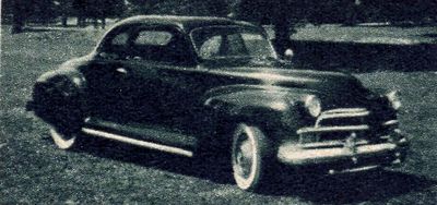 1942 Plymouth Coupe restyled by George Jameson and Richard Lacey for George of Jacksonville, Illinois. The combined talents gave the Plymouth an outstanding exterior and an Olds engine. Its burgundy Red paint job gave the bystanders a good reason to stare. The car appeared in the "Reader's Rods & Custom" in Rod & Custom June 1955.[1]