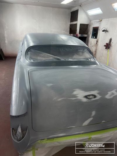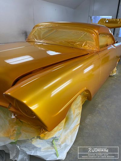 In June of 2021, Jesse's brother-in-law, Ernie Enriquez, was working on the bodywork and primering. After Ernie had covered the body in House of Kolor white sealer, Greg Gonzales applied a cream base. He followed up with four coats of Candy Pearl Pagan Gold, mixed from Pagan Gold, Spanish Gold Kandy, and Pearl. Erik Solorio finished off the paint job with some darker Candy accents late in July of 2021, giving it a Gene Winfield inspired fade paint job.[1]