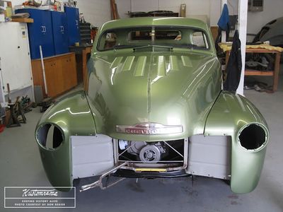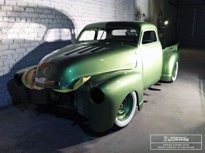 The following year, Rick bought the family's ’48 Fleetline from his parents. It quickly became his canvas. He nosed and decked it, lowered the stance, and reversed the rims. "Goofy Gus" pinstriped the interior, and Fleetline Auto Body, where Rick worked part-time in Omaha, resprayed it in its original metallic gray. Naturally, Rick also split the exhaust manifold.[1]