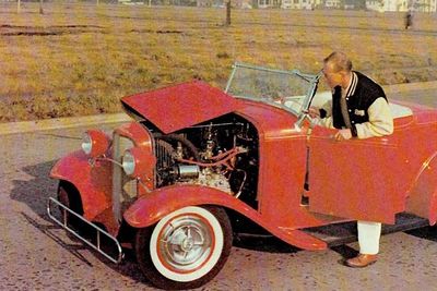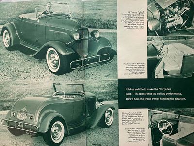 Once completed, the roadster won the 1956 Portland Roadster Show, becoming the first Sweepstakes Winner of the show. A year later it landed a featured story in the September 1957 issue of Hot Rod Magazine. "It takes so little to make the 'thirty-two jump - in appearance as well as performance," the story stated. Described as a street rod, the car was powered by a modified Mercury flathead when Hot Rod Magazine shot it. The mill was hopped up with a Harman & Collins street grind cam, Silvolite pistons, Edelbrock manifold and heads, and a fully balanced 1952 Mercury crank. The exhaust headers ran lakes plugs. Inside, it was fully upholstered by Chuck Blanchard in off-white Fabrolite plastic. Foam rubber was used to form well-contoured seats, and red piping was used to match the Festival Red exterior paint. A Stewart-Warner engine-turned panel was used to replace the stock instrument layout, and the carpet was done in red with white piping. The trunk was also upholstered, and a Cragar dropped front axle provided a forward rake on the car. Bill dressed it up with wide whitewalls, Dodge Lancer hubcaps, and bright white pinstriping.[2] A year later, the roadster was also featured in the June 1958 issue of Car Craft Magazine.[3]