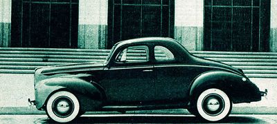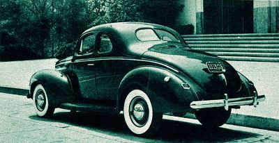 1940 Ford Coupe owned by Bob Brown of Pico, California. When Bob acquired his coupe, it had suffered a gradual decline through the years, and needed a work. Bob rejuvenated the body and chassis and made it appear like new again. The car was mainly kept stock, with deck ornaments, door handles etc, however it was lowered up front by installing a 2 1/2" dropped axle, and mounting 5.60-15 tires. It also featured a wild paint job at the time, which turned lots of heads in Pico, a flame job done in 4 colors! The car was painted a rich metallic maroon lacquer, with the flames done in an orange shade of lacquer blended together with Chinese red and black. The rear tires were 7.60-16, giving it a forward street coupe rake. The trims, bumpers, and bumper brackets were chrome plated. The hood was louvered by Drake Brothers Machine Shop of Maywood. The louvers were punched into the panels for 15 cent per louver.[1]
