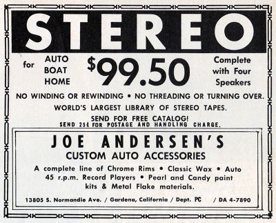 In 1959 Bruce Schwartz began working for Joe. Bruce worked for Joe for several years at the Florence Ave. Shop. Later, Joe sold the property at W. Florence Ave, and moved to a rented shop at 13805 S. Normandie Ave., Gardena, California. He expanded his business by adding retail sales of accessories which included Muntz car stereos, 8 track tapes and some chrome accessories. Later, Bruce worked for Joe again at the Gardena shop.[2]