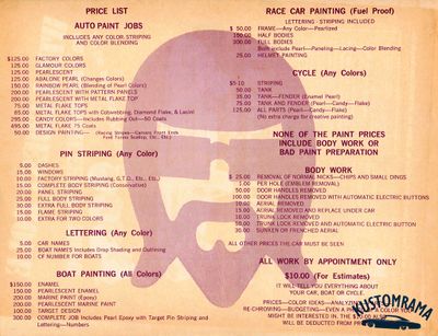 Around 1967 Joe began promoting and selling custom pearlescent paint kit's. Promoted as "Pearl for Pennies", custom enthusiasts could now have a real custom pearlescent paint jobs for little work or cost. The kit included ten "out of sight" standard custom colors to choose from. According to Joe's brochure "Colors by Joe Andersen", Joe had formulated a pearlescent enamel paint that allowed show quality finish. Dan Woods' Milk Truck, and Bob Reisner's The Invader, that won the World's Most Beatiful Roadster Award at the 1967 Oakland Roadster Show was painted with Joe's pearlescent paint kit.