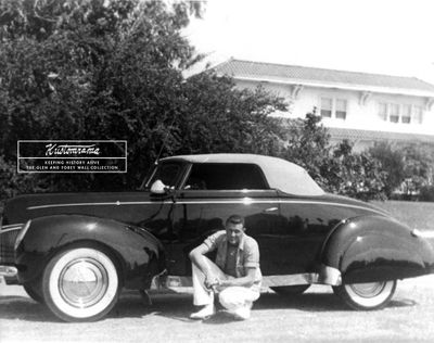1939 Ford convertible originally owned by Jack Runyan of California. In 2016 Glen and Forey Wall told Sondre Kvipt of Kustomrama that Jack used to hang out at State and Hope Street near Huntington Park; "He bought the car brand new at a Ford dealer in South Gate." Jack sold the car to Emil Dietrich of South Gate, California in the mid 1940s, at the time it was nosed and decked, and the running boards had been removed. Chrome panels covered the frame and the holes in the fenders. The license plate was set in, and it ran flipper hubcaps, a single spotlight, and a 1941 Ford rear bumper. Glen and Emil painted the Ford blue with lacquer in Emil's garage. "A good looking blue," Glen told Sondre. This iteration of the car ran 1941 Buick trim on the fenderskirts and 1940 Ford headlights.[1]
