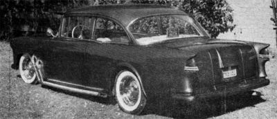 1955 Chevrolet owned and restyled by Satan's Angels member Gordon Burham of Pleasanton, California. Gordon believed in building his own custom, therefore he spent about two years building this built for show sedan. The doors were shaved for door handles, and were electrically operated. The unique front had a rolled front end, formed from 3" tubing, so the nosed hood was recontoured to fit the new molded grille shell.The grille cavity was fit with a split tubular bar assembly. The headlights were shaded in a sort of a beak-like way, and the park lights were filled. The wheel wells were flared and all chrome was removed. Custom exhaust were cut into the fenders, trailing onto the rocker panels. The taillights were 1954 Lincoln units that were shaded and frenched. Two frosted plastic cross sections were added, and the license plate received a special housing. The car was drastically lowered by installing blocks and cutting the coils. It was fit with spotlights and painted Purple Pearl.[1] The interior was upholstered by Fremont Upholstery in white Naugahyde with contrasting lavender fabric forming sweeping patterns on the seats and doors, and almost all of the interior hardware was chromed.[2]