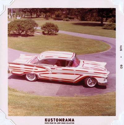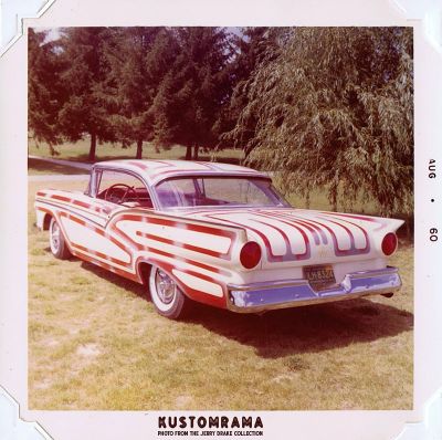 1957 Ford Fairlane owned by Injectors of Lyons President Jerry Drake of Lansing, Michigan. Jerry bought the car in 1959. At the time he drove a customized 1955 Ford known as "India Ivory." One day, while driving down South Cedar street in Lansing he spotted the clean looking '57 on a used car lot. He pulled in to look at it. The owners of the lot were really interested in taking "India Ivory" in on a trade. "The '57 Ford was really clean with low mileage on it. I made a deal on the car." The Ford was mildly restyled by Larry Cooper at Cooper Body Shop, before Jerry gave it a modern scallop paint job. It was nosed and decked, and featured custom taillight lenses and an aftermarket tube grille. The headlights were also molded in and modified to accept 1956 Ford F-100 headlight rings. "My car was painted in July 1960 in my one-car garage by Dave Edmonds. He did it in exchange for me laying out a panel paint job on his '60 Corvette and then putting the finishing striping on it. It was quite common to "trade" work." The scallops were painted red before Dave applied grey fading. Jerry applied yellow pinstriping. Jerry named his second custom "Candy Cane." Jerry kept the upholstery untouched, but he installed a tarp over the back seat. "The tarp had a Viking character on it. I don't think there are any known pictures of it but everyone commented on how neat it looked. The tonneau cover had snaps on it and could be easily removed if I wanted passengers in the back seat."
