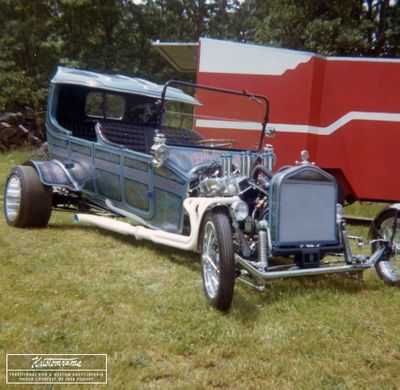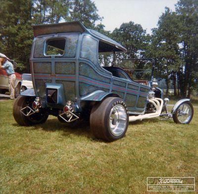 Bitten by the bug, John continued building radical hot rods. He became friends with local hot rodder Dick Schuc, who mentored John, learning him all he could about the trade.[2] "The third car my dad built was a shortened Model T Touring body with a solid fabricated top." Known as the "Ice T," it was powered by a Pontiac V8 engine and transmission from a donor car. "The custom paint was done by Jim Carmichael, a well-known custom painter. John completed his third build about 1968."[1]