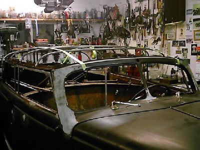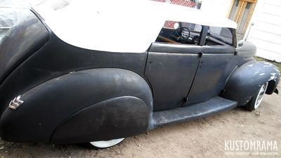 1940 Ford Convertible Sedan owned and restyled by John Williamson of Sunland, California. John's Ford was assembled from parts and pieces using a steel roof four-door sedan and tub parts from Miguel Torres. In 2017 John told Kustomrama that he cut the sedan apart leaving the cowl and the lower quarter panels, "then I added the convertible sedan windshield, doors seat back with the tub supports and tub doors and latches. I had to use the door bottoms from the sedan to fix the tub door bottoms. I round the decklid top corners and peaked the hood with the last part used to unlatch the stock 40 hood latch. Then I built the Carson Top frame from an original tub top assy, skinned it with aluminum and then hard foam and upholstery by North Hollywood Upholstery. I plan to paint it 41 Chevrolet Ruby Maroon and do the interior like the original Ray Vega tub in light tan with the seat tops embossed with the tooled flower pattern."[1]
