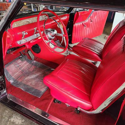 As you walk around it, you can quickly tell that so much custom work has gone into this ride. She started life as a 4-door sedan and has been converted to a 2-door Hardtop! Speaking of tops, the top has been chopped 5 1/2 inches! 1955 Cadillac headlamps were sectioned into the front fenders. It was dressed up with a 1955 Lincoln grill and 1956 Packard taillights. Ford Aerostar springs lowered it down in the front, and the rear was dropped 4 inches with blocks. Inside, the 1964 Oldsmobile lipstick red leather interior contrasts well with the exterior, looks sharp, and is in nice shape. Once your eyes move past the seats, you can’t help but notice the skull sitting atop a Torque Wrench Shifter. She has a custom-made console, Bluetooth Stereo in the dash, and a custom upholstered trunk. Under the hood is a 302ci V8 backed by a C6 Automatic Transmission. The odometer is inoperable.