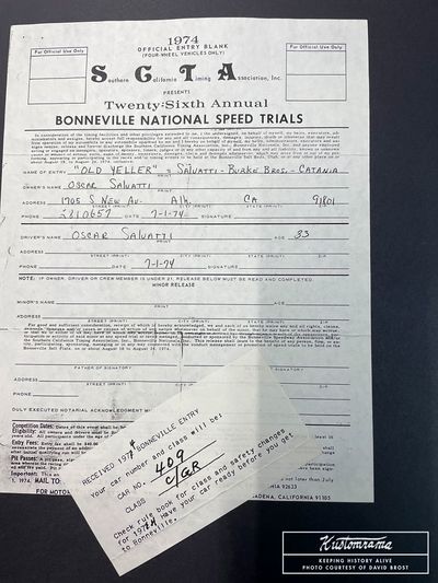 In the mid 1970s Oscar and his brother-in-law, Bill Burke, built the roadster into a class C/GR Bonneville/Dry Lakes race car. Known as "Old Yeller," it ran 123.96 mph in 1975 according to the SCTA timing tag mounted on the dash.[1]