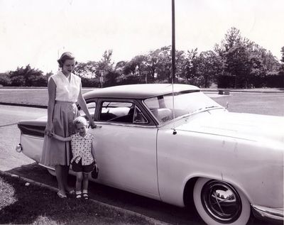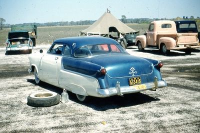 1952 Ford Coupe owned and restyled by Kansas City Cranktwisters member Ray Erickson of Kansas City, Missouri. The car was also known as "The Whistle Bait" as his wife Joan drove the car a lot. In a featured story in Rod Builder & Customizer November 1956 the car was actually described as Joan's car. Ray and Joan did everything on the car themselves in their neighbors back yard next to their apartment. $350 was spent on materials during the custom work. Ray and Joan started to restyle the car in the summer of 1955. The chop on the car was started while Joan and their daughter were in California with her family for a couple of weeks. Joan didn't know about the chop until she returned from California. Ray chopped the top 3 inches all around. He did not cut the windshield, but laid it instead back under the roof. By doing this Ray also made a visored roof over the glass. A new rear window was made out of Plexiglass. As Ray was sabersawing the Plexiglas, it chattered and made a 2 inch crack. He didn't have money to buy more Plexiglas, so he drilled a hole to stop the crack and fitted 2 pieces of chrome strips so it looked like a 3 piece window. The hood was shaved before 114 louvers were punched into it. The roof and fender skirts also got some louvers. All louvers were made with a punch handmade from a brass die. Dick Boucher held a big block of wood against the outside part of the louver die, while Ray punched from the inside. The stock grille was replaced by a 1949 Mercury piece and the headlights were peaked and frenched as were the parking lights. The deck lid was shaved of its ornamentation and the taillights got the same "frenched and peaked" treatment as the front. Non-functional scoops were made on the quarter panels. The body was lowered 6 inches in the rear and 5 inches in front. In addition to lowering blocks, they cut one and a half turns out of the front coils, C'ed the frame and installed rubber cushions above the coils. Once the bodywork was done, the Ford was painted in a 1956 Dodge Royal Blue on the top, and Fleet White on the lower part of the body. After 8 coats of clear lacquer, Ray did the pinstriping.[1] Union Auto Trim of Kansas City stitched the interior and headliner and Ray installed the pieces. The dashboard and window frames were also painted in a two tone color. The build was completed in the spring of 1956 and not long after its debut it was featured in Rod Builder & Customizer November 1956.[2]
