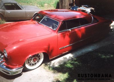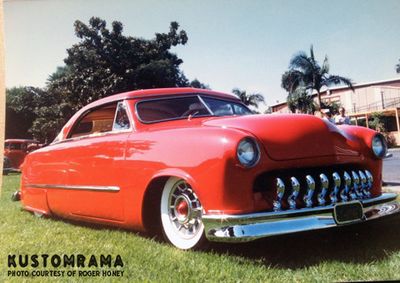 1951 Ford Victoria owned and restyled by Roger Honey of San Diego, California. In 2015 Roger told Kustomrama that the build was started in the Summer of 1985, and finished half a year later; "I had been looking for a clean 1949 - 1951 Mercury when I found the Vicky. I had always wanted to chop a Vicky the right way using the stock back window, so I decided to go with it in place of a Merc for the time being. I have never seen a Vicky chopped the same way I did this one since it was done."[1]