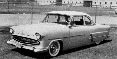 1953 Ford owned by Lakewood Creators member Roger Miller of Bellflower, California. Up front Roger's car had headlights shades crafted onto the fenders in order to modernize the front-end appearance. The hood corners were rounded, the upper grille shell reversed and frenched into the gravel pan. Parking lights from a 1949 Chevrolet were used in the corners of the mesh-type grille center. The grille was encirceled with a round rod. Taillights were frenched into the rear fenders using stock outside lenses with 1954 Oldsmobile center pieces. The car was nosed, decked and shaved for door handles, doors and deck lid were pushbutton operated. The exhaust tips were made of driveshaft housings. Ed Schelhaas did all the custom body work, while his painter George Newton painted it light teal blue in Nitro lacquer. Larry Watson of Watson's House of Style pinstriped it in Navy blue.[1]