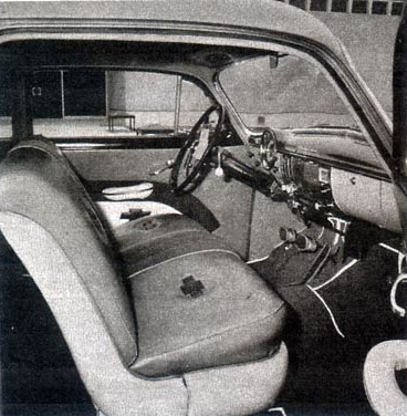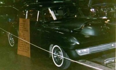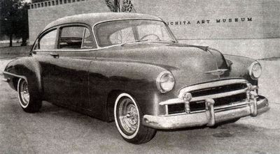 1950 Chevrolet Fleetline restyled by Stuckey Kustom for Ronnie Knepp of Wichita, Kansas. After the car was totaled, Ronnie decided to have it restyled instead of returning it to its original shape. The car was replaced from the quarter panels and forward. The first version of the car, as it appeared in Rod & Custom September 1964 maintained a stock front end, but with a one-piece windshield from a 1950 Oldsmobile. The rear end received asymmetrical styling by installing 4 taillights on the left side of the car. The taillighst were hand formed from Lucite. The car was fit with a rolled rear pan hand formed by Dave Stuckey. Split bumpers from a 1960 Chevrolet Corvette were installed in the rear pan. Small back up ligts were located to the right of the offest licens plate housing. Once the bodywork was done, the Chevy was painted crystal green. Inside the car was upholstered by Paul Mantz in tan and brown Naugahyde. Power came from a 1957 Chevrolet engine that was bored .080 over. The heads were ported and polished, and two Rochester carburetors were mounted on a Fenton manifold.[2]