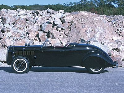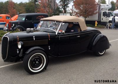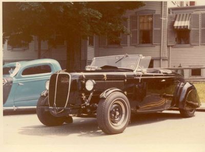 1936 Ford roadster owned and built by Sebastian "Sabie" Rubbo of Massachusetts. Sabie started working on his roadster at age 23, in 1945. He had just gotten out of the Navy, and was inspired by the cars he saw racing at the dry lakes near where he was stationed in Southern California. When he returned back home, he bought a 1936 Ford roadster that had been hit up front. The car was so bad that he decided to put a better chassis under it. He removed the body from the original frame, and installed it on a rolling 1940 Mercury frame. The body was channeled 6 inches over the frame, and the rear suspension was modified by adding a Model A crossmember and spring. Other 1940 Mercury parts such as the wheels and steering column found their way to the car as well. A 1932 Ford rear bumper was installed in the rear of the car. The running boards were removed, and front fenders were made from a portion of a 1936 Ford spare tire ring. Rear fender skirts were custom fit using five Dzus fasteners. Up front, Sabie installed a 1937 Ford truck grille that he chopped 6 inches and narrowed about 3 inches. The hood had to be extended to meet the shell. Inside, Sabie installed a bench seat from a mass transit bus. Sabie completed the build in 1946. Once completed, he drove the car everywhere. Any dash plaque he could get from a car show he attended, he added to the sill plate.[1]