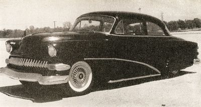 1954 Chevrolet restyled by Wayne Ludmas of Ohio. Starting in the front, Wayne frenched the headlights and the gravel pan. He also nosed and peaked the hood, and installed a front bumper from a 1953 Ford. The grille was kept basically stock, but he added more vertical grille bars. Wayne added scooped Mercury side skirts, shaved the decklid and installed taillights from a 1955 Dodge into the rear fenders. A 1956 Pontiac split bumper was added to the extended rear fenders. The rear was dropped two inches. Wayne kept the stock engine, but hopped it up with dual carburetors, a McGurk manifold and Corvette headers. Wayne decided to chrome many of the engine parts, making it a beautiful sparkling engine. Side trim from a 1955 Buick separated the two tone paint job. The total customizing cost was $850.[1]