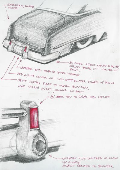 December 2008, an issue of The Rodders Journal with Sam Barris' 1950 Buick on the cover inspired Yaril to french the headlight on his Buick. The headlights were frenched by welding the stock rings to the fender. After the headlighs were frenched, Yaril pinstriped scallops on the car in order to hide the edges were the two black paints met.[2] A half year later, in July 2009, Yaril decided it was time to chop the roof on his Buick and relocate the taillights to the bumperettes. Earlier that year he had also relocated the gas filler neck to the trunk of his car and welded the gas filler door shut. By July, 2009, Yaril had decided that it was about time to chop the top on his Buick. He was not sure about how much he was going to chop it, but knew that it had to be less then 3 inches in order to keep the stock three piece rear window. Yaril ended up chopping the top 2 vertical inches up front and at the b-pillar. During the chop the rear three piece window was laid down and moved forward about 3”. After the chop, the taillights were relocated to the stock bumperguards.[3]